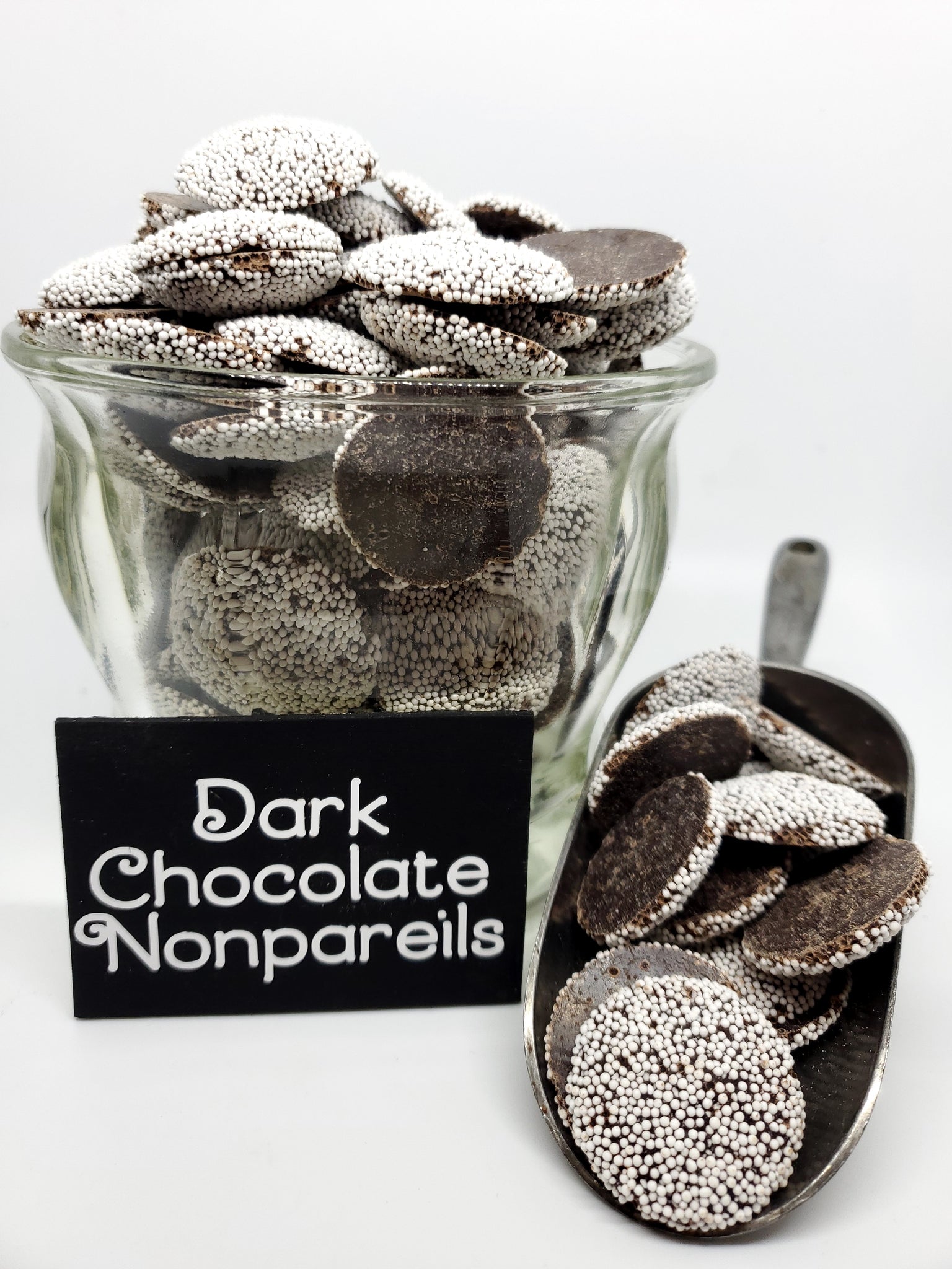 Chocolate nonpareils are a centuries-old confection. These premium dark chocolate discs are coated in crunchy white sprinkles on one side.